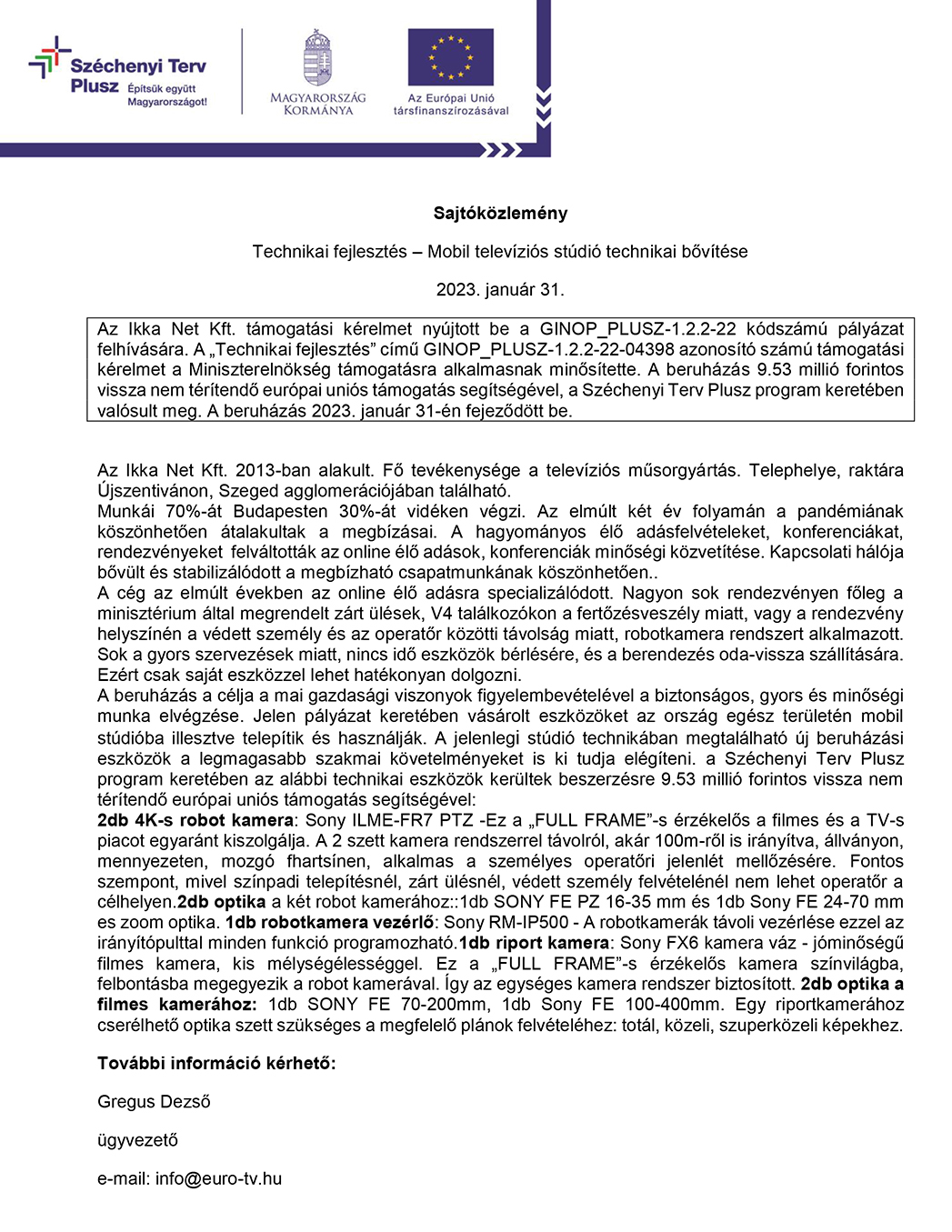 2023 -2024 időszakra szerződéses partner filmgyártásra. Robotkamera rendszer minden rendezvényen jelen van.